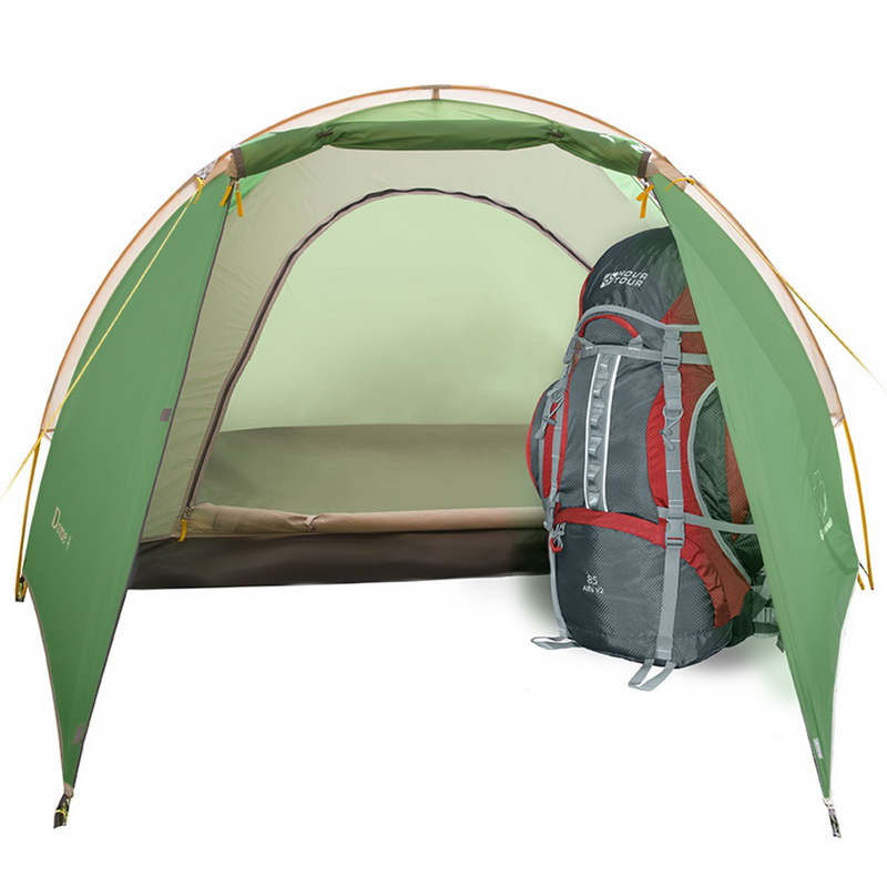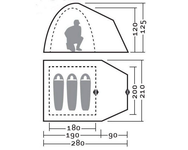 ТамбурОдин большой тамбур на выносной дуге, шириной 90 см. В него поместится обувь и рюкзаки проживающих в палатке. Во время дождя в тамбуре можно приготовить еду на туристической горелке. В хорошую погоду дверь тамбура полностью подворачивается наверх, обеспечивая вентиляцию и освещение внутри палатки.